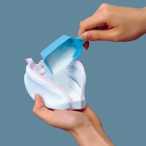 ![]() 衣類への付着を防ぐ 粉石けんや溶け残りが外に出にくいので、衣類への付着をおさえます。また、洗濯中にファスナーが開くことを防ぐためファスナーカバーを採用しました。 | ◇ | ![]() 洗濯槽の汚れにも 洗濯槽の汚れや黒かびの原因でもある、せっけんカスの付着もおさえます。 |