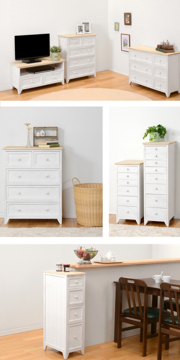 アンティーク塗装を施した、かすれたホワイトカラーが魅力的な愛らしいテレビ台です。どこか懐かしい素朴なテイストは、お部屋をお洒落な空間に演出します。また、チェストは完成品なので、取り出してすぐに使用する事ができます。