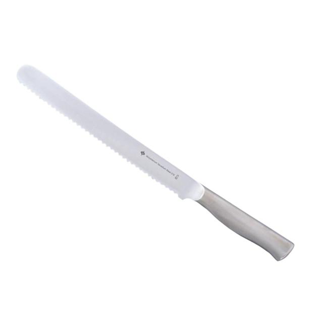 モリブデン・バナジウムを添加した特殊ステンレス鋼を使用したブレッドナイフです。通常のステンレス鋼に比べ鋭利性、耐久性、耐食性に優れており、切りくずの出にくい特殊ウェーブ刃を採用しています。シンプルなデザインで使いやすいので多くの人に愛されているこだわりの逸品です。