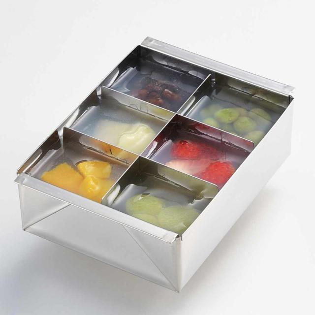 羊羹や寒天、ムースやゼリーなどを冷やし固めるのに使える流しかんです。仕切りを使ってそれぞれにお好みのフルーツなどを入れて楽しめます。ステンレス製で冷えやすく、錆びにくいのでお手入れも簡単です。