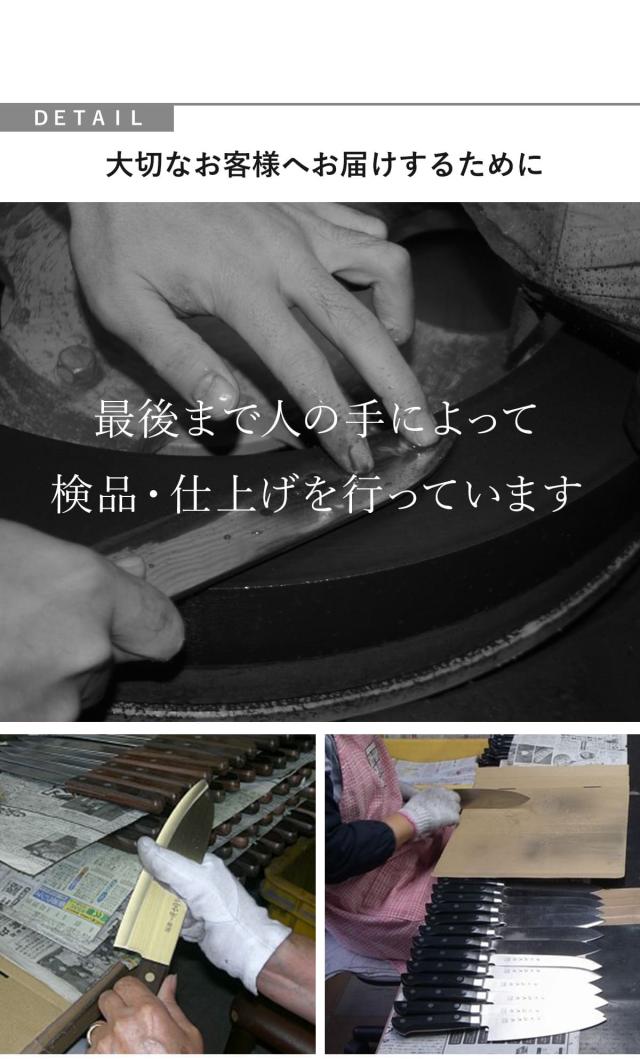 大切なお客様の元へ安全、安心、自信のある包丁をお届けできるよう、人の手によって手入れ、何度もの検品、最後の箱詰め作業を行っています。