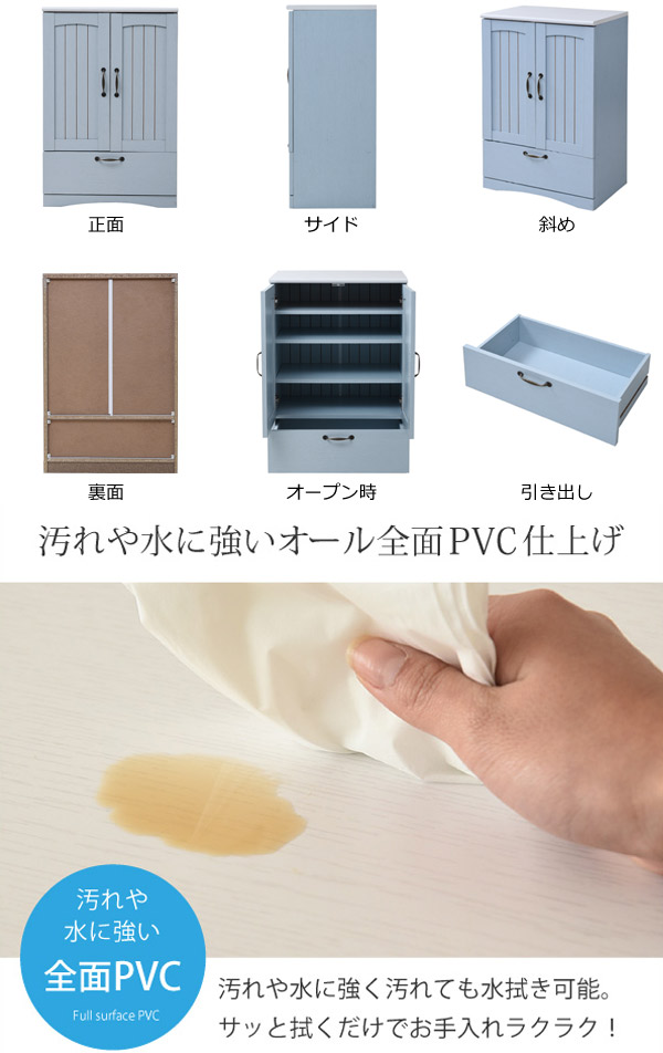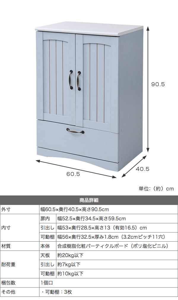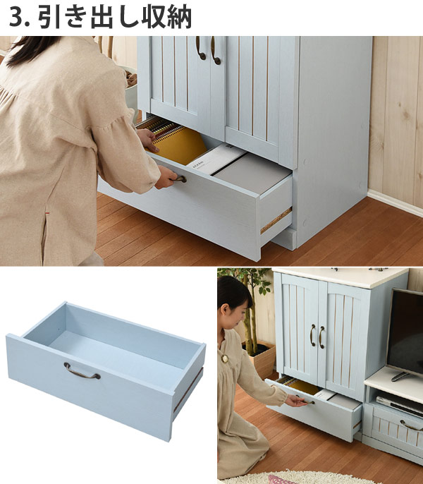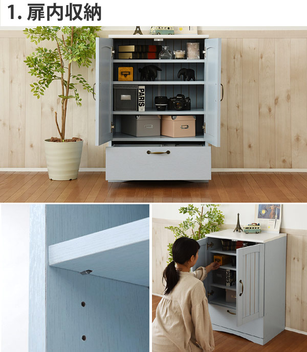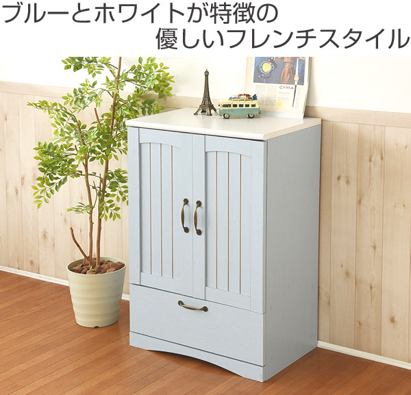 キャビネット 両開き 引出し付 カントリー調 フレンチスタイル 幅60cm ( リビング収納 収納棚 引き出し サイドボード おしゃれ ブルー 水色 アンティーク シャビーシック フレンチナチュラル チェスト )