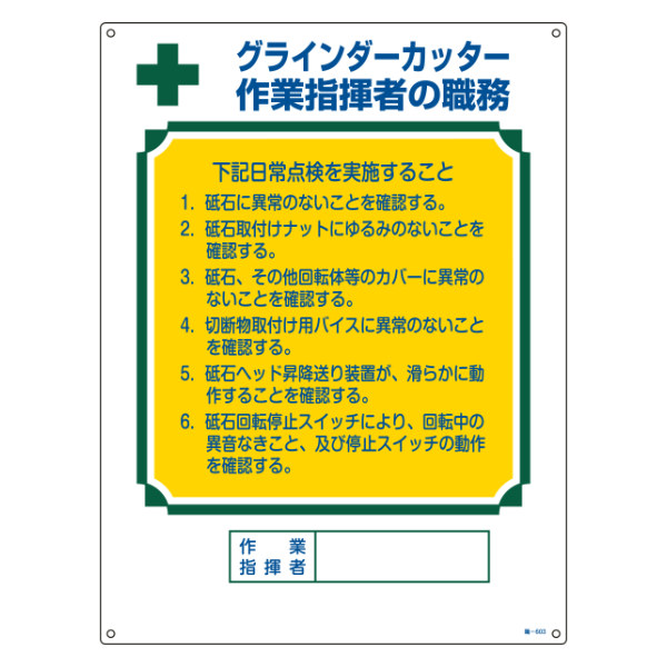 職務標識板 作業主任者用 「グラインダーカッター作業指揮者の職務」 60×45cm 両面テープ6枚付 ( 看板 訓示 パネル 壁掛け 氏名 名前 明記 書き込み グラインダーカッター作業指揮者 グラインダーカッター 作業指揮者 )