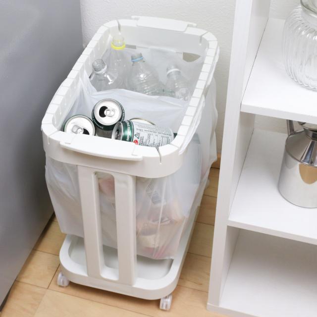 持ち手付きのレジ袋を引っ掛けて使える、キャスター付きのゴミ袋ホルダーです。袋を複数枚引っ掛けることができるので、家庭で出る資源ゴミのビンや缶、ペットボトルなど、種類別に捨てることができます。