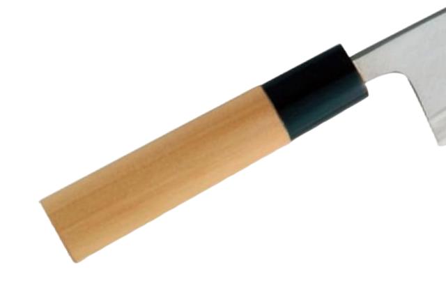 口金には水を吸うと締る性質を持った水牛角を使用しています。錆びに敏感な和包丁は、水分を良く拭き取って乾燥させる事が錆び防止への第一歩です。