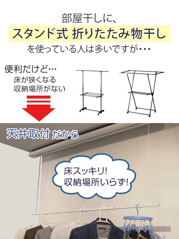 床スッキリ、収納場所いらずの天井取付物干し手軽で便利な床置き式物干しですが、物干しを置くとどうしても床が狭くなったり、使わないときの収納場所が必要になったり。