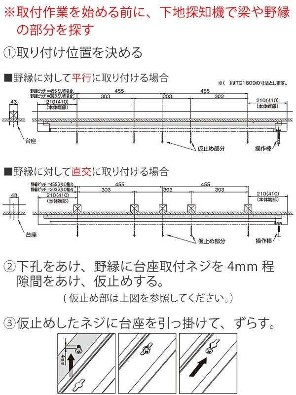 ●取り付け前に、下地探知機で梁や野縁の部分を探す必要があります。※下地探知機はホームセンターなどでお買い求めください。