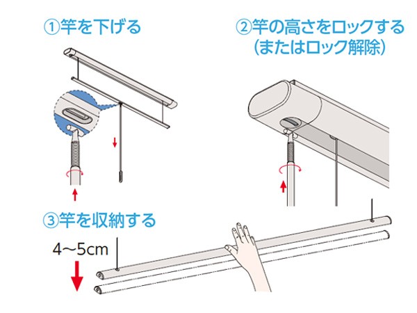 簡単操作で使いやすい操作棒でお好みの高さに調整して使用できます。竿を使用しないときは、操作棒は取り外して付属フックで壁にすっきり収納できます。竿を少し引き下げ、手を離すと竿が本体に収納されます。