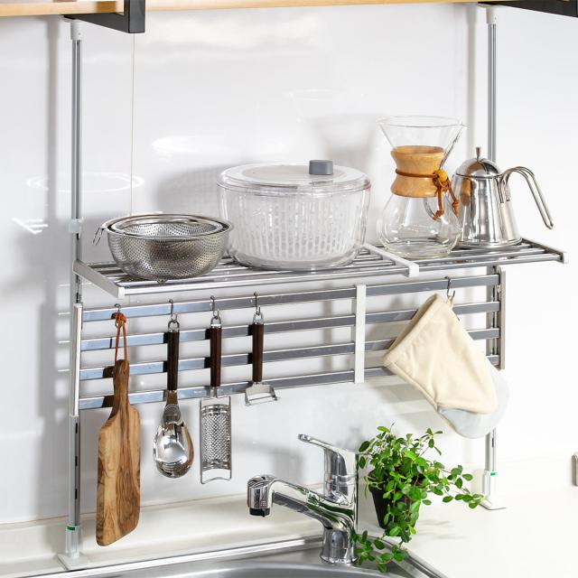 壁面を傷つけない突っ張り式の棚は、窓枠や出窓、またはシンクと吊り戸棚の間などの上下に突っ張れる丈夫なところに設置できます。賃貸マンションやコンパクトなキッチンの一人暮らしの方におすすめです。