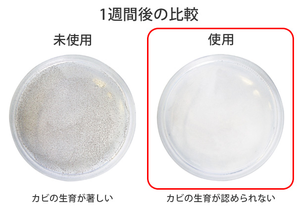 シャーレの中に試験菌を入れ、一方にシャーレのフタに本品1gを設置し、もう一方には何もせず、実験を行いました。その結果、1週間後には「勝手にカビ取り」未使用はカビの生育が著しく、「勝手にカビ取り」使用のシャーレにはカビの生育が認められない結果となりました。