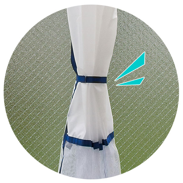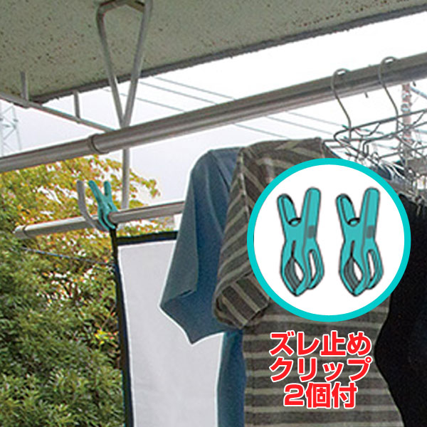 ループを竿に通すだけの簡単取り付けです。ずれ止めの竿クリップも2個ついています。使わない時はまとめられるバンドが付いているので束ねて収納ができます。