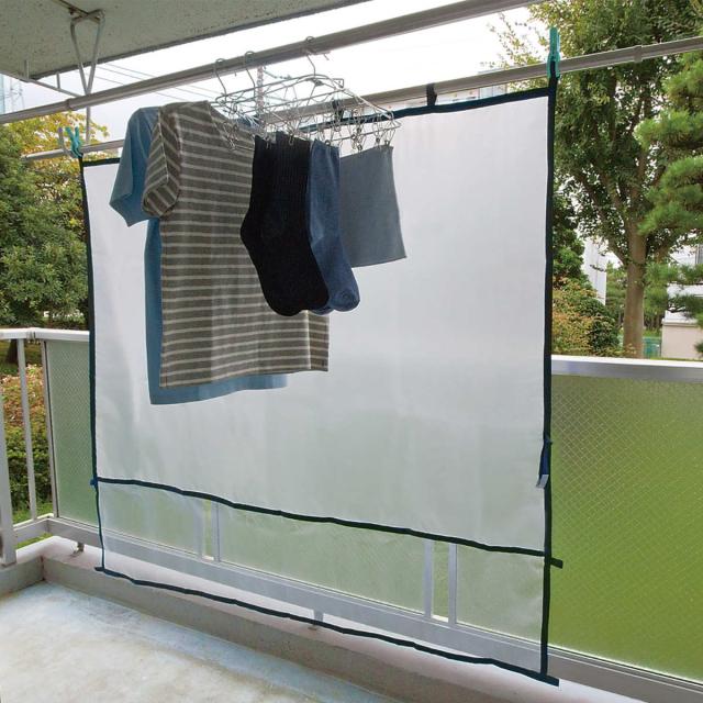 ひさしのせまいベランダやマンション・アパートでも、突然の雨から洗濯物をガードします。半透明なので明るさを保ちながら、ちょっとした目線よけや、日除けにもなります。下部は通気性の良いメッシュネットになっているので、風も通します。