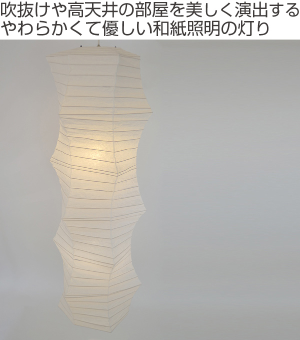 吹き抜けや高天井のお部屋を、心が安らぐ落ち着いた空間にお家でのひとときを贅沢に、そしてゆっくりと過ごしたい…。和紙のあかりはそんな願いを十分すぎる程かなえてくれます。和紙を通してみる灯りはやわらかく、とてもリラックスできます。 ![]() 開放感のあるお部屋を演出する縦長の和紙照明存在感がある縦長の大きな照明で、吹き抜けや天井の高いお部屋にぴったりの照明です。凸凹した形が特徴的で、金棒のように力強く迫力あるフォルムです。約50cm近くのシェード幅があるので、インパクトがあります。 やわらかく優しい光りで、美しい空間を演出します。吹き抜け用、また店舗照明としてもオススメです。 ![]() | ||
