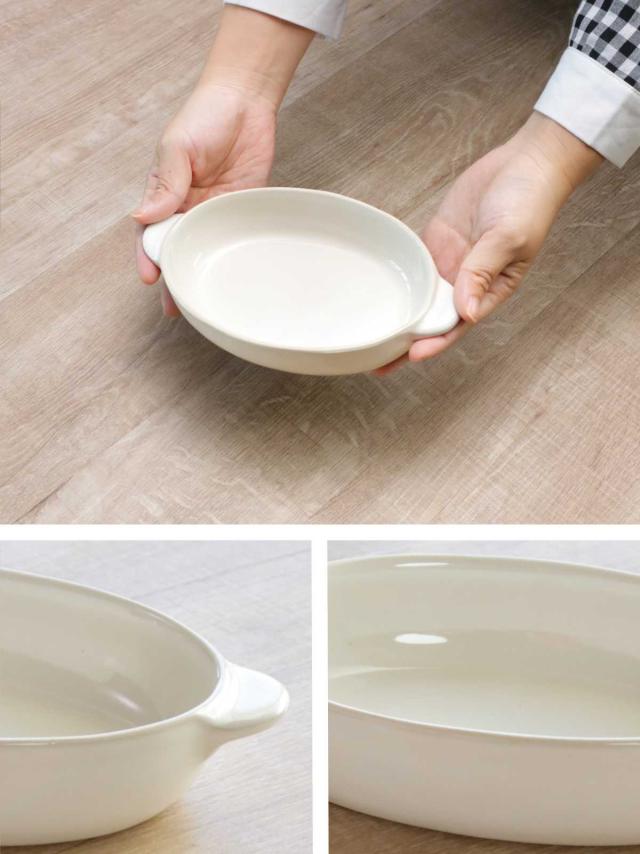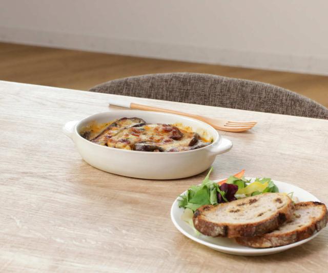 ほくほくのグラタンにぴったりなオーバル型のグラタン皿です。あたたかみを感じる素朴な雰囲気で、飽きのこない長く付き合えるデザイン。深さがあるので、野菜のグリル料理や煮込みハンバーグなどにも使えます。