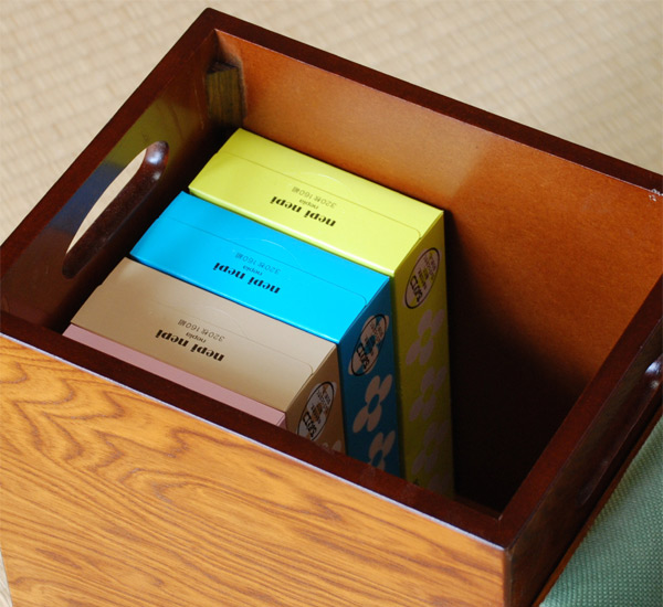 かさばるけど置き場に困るティシュペーパーなど箱椅子の周辺でお使いになる物のストックなどを収納していただくのに便利です。