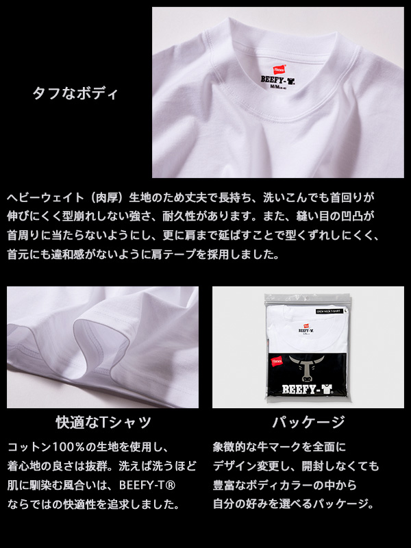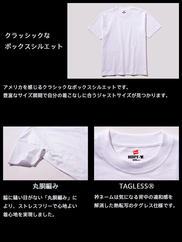 Hanes BEEFY-T Crew Neck L/S T-Shirt 2 Pack Set ヘインズ BEEFY-T クルーネック 長袖 Tシャツ 2枚組セット 1975年に誕生したビーフィーTシャツ。 当時はヒッピー文化の象徴でもあるプリントTシャツのボディとして開発され、 これをきっかけにアウターとしてのTシャツが定着しました。 ビーフィー Tシャツはその名の通り、丈夫で洗えば洗うほど肌に馴染む 独自の風合いが特徴のTシャツとして親しまれています。 ヘビーウェイト(肉厚)生地のため丈夫で長持ち、 洗いこんでも首回りが伸びにくく型崩れしない強さ、耐久性があります。 コットン100%の生地を使用し、着心地の良さは抜群。 洗えば洗うほど肌に馴染む風合いは、ビーフィーTシャツならではの快適性を発揮します。 縫い目の無い丸胴ボディを採用。アメリカを感じるクラシックなシルエットです。 【タフなボディ】 ヘビーウエイト(肉厚)生地のため丈夫で長持ち、 洗いこんでも首回りが伸びにくく型崩れがしにくい強さ耐久性があります。 【快適性】 綿100%の生地を使用し、着心地の良さは抜群です。 洗えば洗うほど肌に馴染む風合いはBEEFY-Tならではの快適性を発揮します。 【シルエット】 縫い目の無い丸胴ボディを採用し、 アメリカを感じるクラッシックなボックスシルエットです。 【パッケージ】 BEEFY-Tの象徴的な牛マークを前面に配したパッケージデザイン。 ※入荷時期によっては生産国が異なります。 生産国で気になる点がございましたらお問い合わせください。 ※生産国が理由での返品はお受けできませんのでご了承ください。 | ||||||||||||||||||||||||||||||||||||