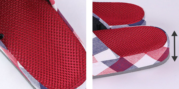 厚さ約2.5〜3.5cmの厚底タイプなので、床からの冷えを感じず、長時間履いても疲れにくいです。また、中敷はメッシュ素材なので、汗のベタつきを防いでサラッと快適な履き心地を実感できます。素足履きにもおすすめです。