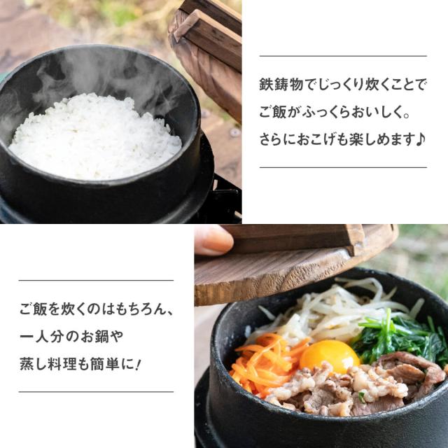 熱が均一に伝わるため、素材の旨味を引き出します。ご飯や一人鍋、蒸し料理もふっくらとおいしく仕上がります。料理と一緒に手軽に鉄分補給ができるのも魅力です。