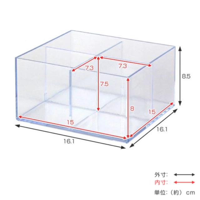 | サイズ | 外寸:約 幅16.1×奥行16.1×高さ8.5(cm) 内寸:約 幅15×奥行15×高さ8(cm) 一区切り分:約 幅7.5×奥行7.5×高さ7.5(cm) |