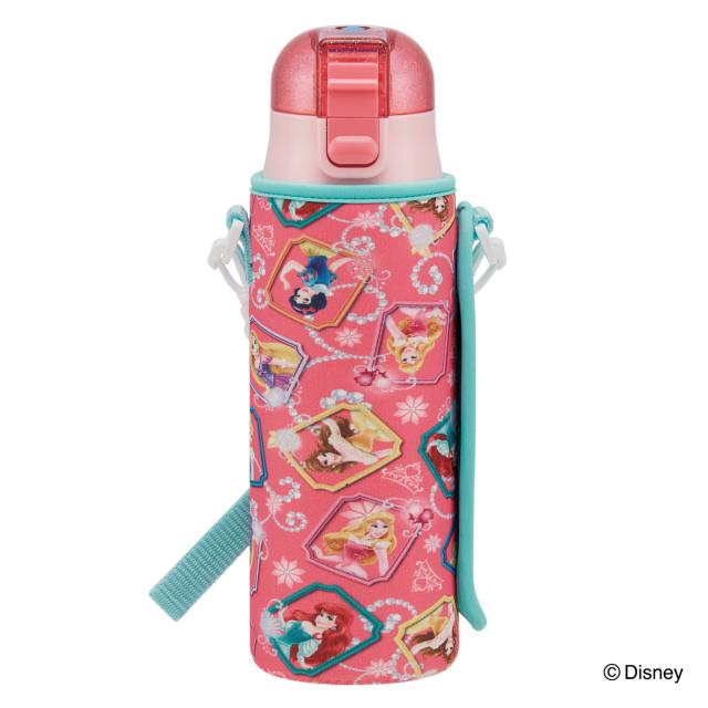 子供用水筒 直飲み ワンプッシュボトル ディズニープリンセス カバー付き ショルダー付き 保冷 470ml ( すいとう 保冷専用 ステンレス製 スポーツボトル ダイレクトステンレスボトル ベルト付き 子供用 キャラクター )