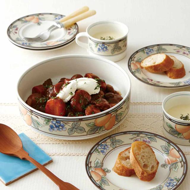 大人っぽい配色でデザインされたハーベスト柄が、エレガントな食卓を演出する「ガーデンハーベスト」シリーズです。外国映画のワンシーンのように、優美に食卓を彩ります。