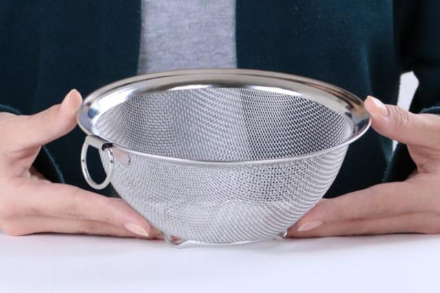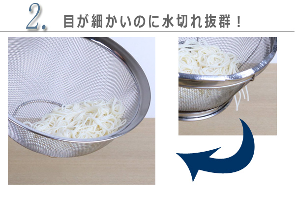 麺類やひじきなどを水切りする際に、食材が網目に刺さったり抜けて流れてしまった経験はありませんか?クックパル・スマートは細かい目で食材をこぼさないのに水切れも抜群です。