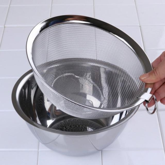 ザルにはリングが付いているので吊るすことができ、洗った後も乾きやすいです。また、ボールなどと重ねて収納した際にはつまみにもなり取り出しやすいです。