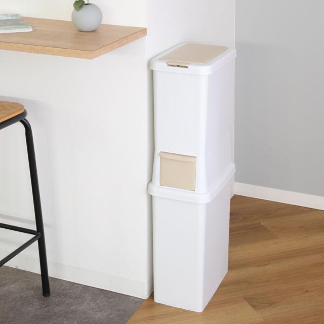 分別に便利な2段式のダストボックスです。上段に21L、下段に26.5Lの合わせて47.5Lのゴミが収められます。たっぷりサイズなのにスリムで縦型なので、場所をとらずに設置できます。生ごみや燃えるごみは上段に、空きビンや缶などは下段になど、ご自由に分別できます。