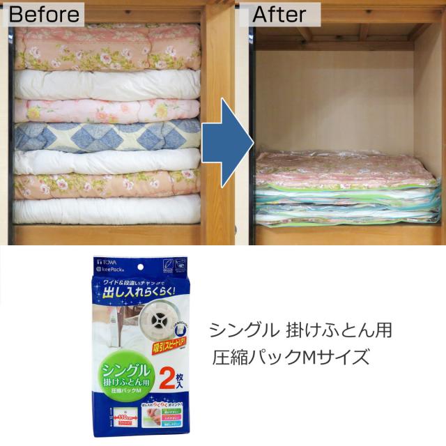 ●圧縮袋Mの収納目安はシングルサイズの掛け布団なら1枚、肌掛け布団なら2〜3枚です。