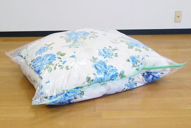 かさばる布団や、アウターなどの分厚くて場所をとる衣類の収納に関するお悩みを解決してくれるのがこの圧縮袋です。吸引スピードがアップした圧縮袋を掃除機で吸引するだけで、かさばる布団もあっという間にぺったんこになります。空いた空間を新たな収納スペースとしてお使いいただけます。