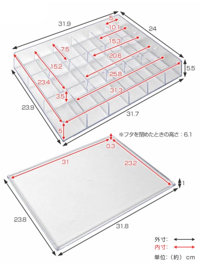 | サイズ | 約 幅31.9×奥行24×高さ6.1(cm) 仕切り一つ分の内寸:約 幅5×奥行7.5×高さ5(cm) 仕切りを全て外した内寸:約 幅31.3×奥行23.4×高さ5(cm) |