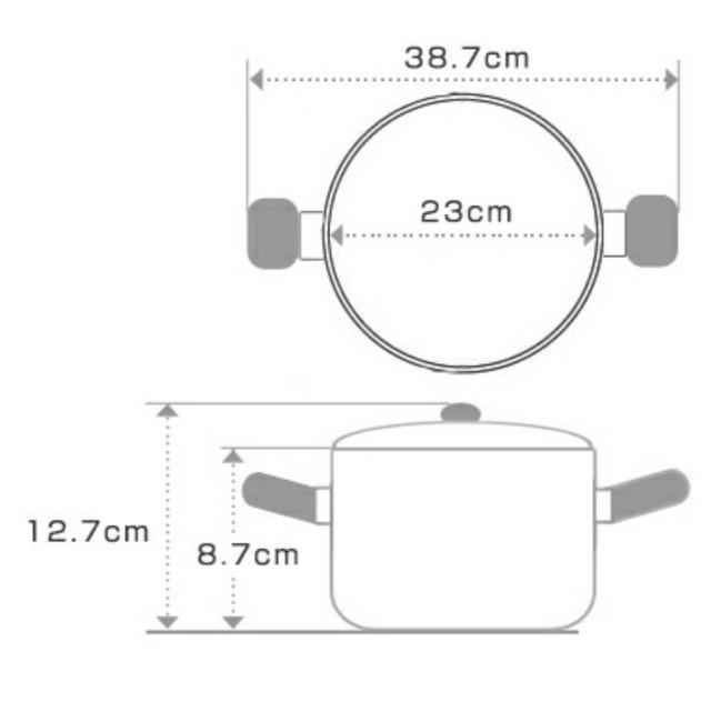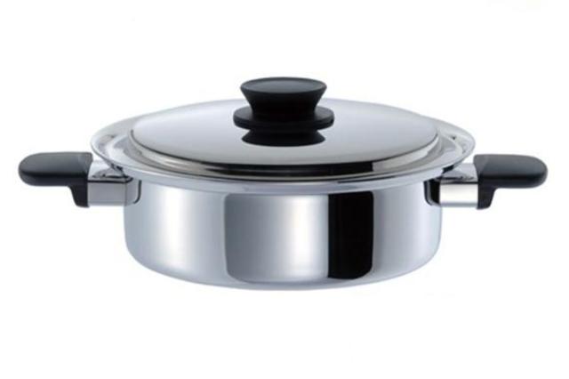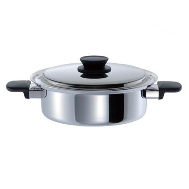 | 材質 | 本体:3層クラッド材(内側:ステンレス鋼、中心:アルミニウム合金、外側:ステンレス鋼) 本体内面:ラセン研磨仕上げ 本体外面:ミラー研磨仕上げ 蓋:ステンレス鋼 ハンドル:フェノール樹脂 蓋ツマミ:フェノール樹脂 |