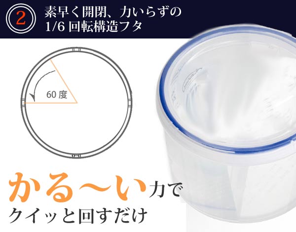 ●フタを素早く開閉できるクイック構造で、フタは、約1/6回転(約60度)で開閉できます。