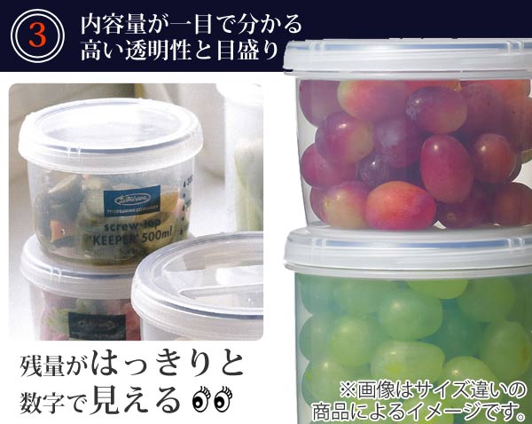 おすすめポイント ![]() ![]() 商品詳細 シリコーンパッキンで完全密閉パッキンにはシリコーンを採用しているため、晩ご飯の残りのシチューやカレーなどの汁物、臭いのつよいらっきょなどの漬物の臭いを強力な密閉力で汁漏れ・におい漏れをしっかりガードします。また、カラーパッキンですので、汚れやヨレ、外れが一目で分かります。 素早く開閉できるフタは、約1/6(約60度)回転させると開閉できます。フタの外周にはシボ加工を施し、すべり止めを4箇所に配置。開閉時にフタを持ち直す必要がありません。密封性がよく汁漏れもしないのに、「フタがキツく閉まって開けにくい!」という心配がなく、軽くクイッと回すだけなので、女性やお年寄りの方にもご使用いただきやすいです。 中身が確認できる視認性のよさフタ・本体が透明ですので、内容物がパッと見て確認できます。冷蔵庫の中やキッチン収納の中で、「どこに何を入れたかな?」と探す手間いらず!本体に見やすい目盛りが付いているため、残量を確認することはもちろん、ドレッシングやプロテインなどのドリンクを作る際にも、量を測りながら入れることが出来、重宝します。 冷凍OK!レンジOK!食洗機OK!冷凍庫に入れていただくことも出来るので、買い込んだ食材の保存や作り置きにとっても便利♪フタを外せば、冷凍したものをそのままレンジで解凍・加熱が可能です。夕飯の残りを入れておいて、お弁当に持っていってもレンジを使用し、温かな状態で食べることも出来ます。食洗機での使用も可能ですので、お手入れも楽チンです。 衛生的に保存が出来る素材に抗菌効果のある銀イオンが入っているので、雑菌の繁殖を抑え衛生的に使えます。 ピタッと片付くサイズ展開シリーズで6サイズの展開があります。深型には【500mlと1500ml】の2種類、浅型には【250ml、500ml、750ml、1200ml】の4種類があり、浅型を2つ重ねると深型の高さとピッタリ。収納時に便利な構造です。 入れ子式になってさらに省スペース浅型・深型はそれぞれ入れ子収納が可能です。棚やシンク棚に無駄なスペースを作らず収納できます。 |