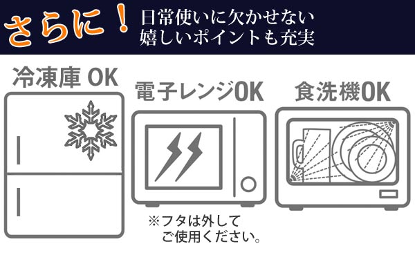 ●耐熱性のあるシリコン製パッキンを採用しているため、晩ご飯の残り、シチューやカレーなどの汁物、気になる汁漏れ・ニオイを強力な密閉力でしっかりガードします。