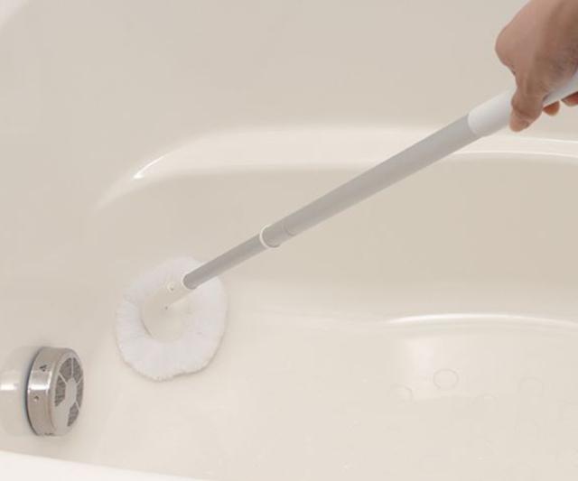 別売りの伸縮アルミハンドルを取り付けられます。腰をかがめずに浴槽が磨きやすく、高いところのお掃除にも便利です。