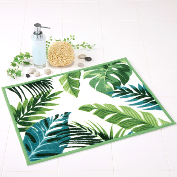グリーンの癒し効果を感じられる、ボタニカル柄のバスマットです。アクリル生地なので、ふっくらと柔らかな踏み心地を感じることができます。また縁取りがされているので毛がほつれにくく、長く綺麗にお使いいただけます。