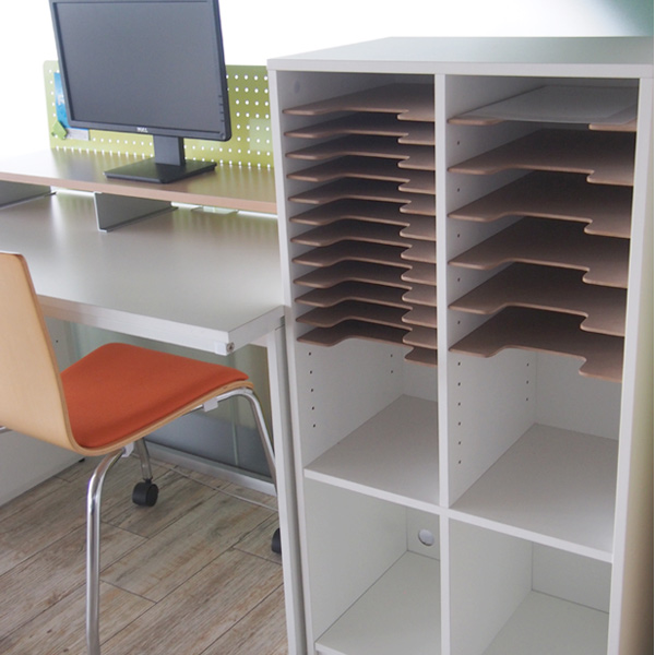 カルテやパンフレット・書類などを細かく仕分け収納ができるペーパーラックです。低めのロータイプで、圧迫感がありません。医療施設でも扱いやすい清潔感のあるホワイトカラーのシンプルなデザインです。