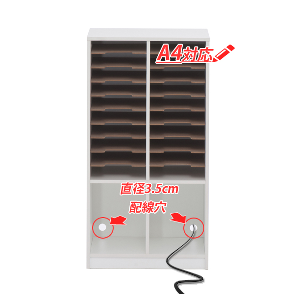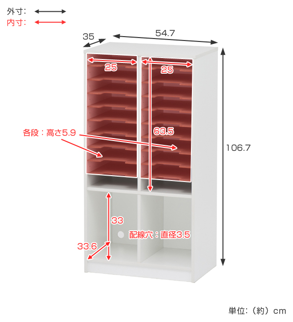| サイズ | 約 幅54.7×奥行35×高さ106.7(cm) 上段内寸(左・右):約 幅25×奥行33.6×高さ63.5(cm) 下段内寸(左・右):約 幅25×奥行33.6×高さ33(cm) 配線穴:直径3.5cm |