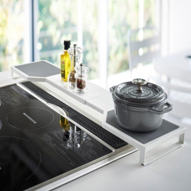 どんなインテリアにも合わせやすい白のシンプルでスタイリッシュなデザインのコンロ奥ラックです。コンロ奥のデッドスペースに調味料や小鍋などを収納し快適に料理ができるアイテムです。