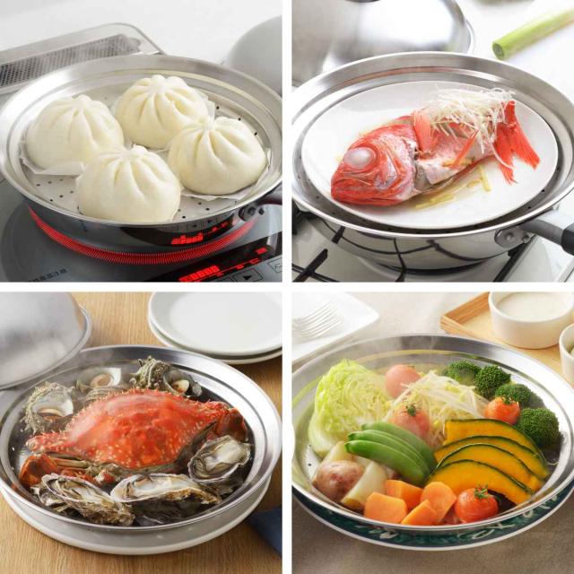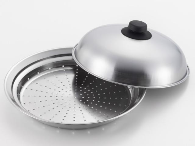 お手持ちのフライパンにのせるだけで、蒸し料理が作れるステンレス製の蒸しプレートです。大きな専用蒸し器をわざわざ準備しなくても、手軽に蒸し料理が作れます。プレートと蓋のみなので、簡単に洗うことができ、かさばらず収納できるのもうれしいポイントです。