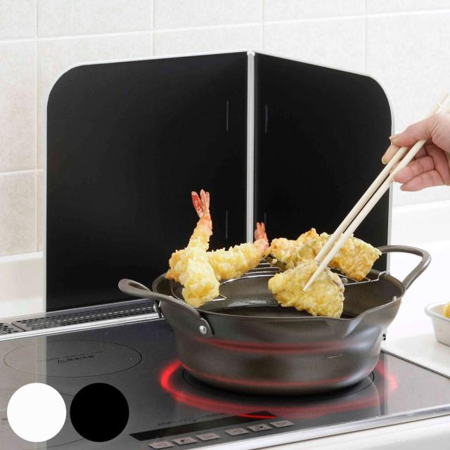 油はねが気になる調理の時、フライパンや鍋のそばに立てるだけで設置は完了。2面タイプのレンジガードなので、コンロやIH、鍋などのサイズを気にせずにお使いいただけます。