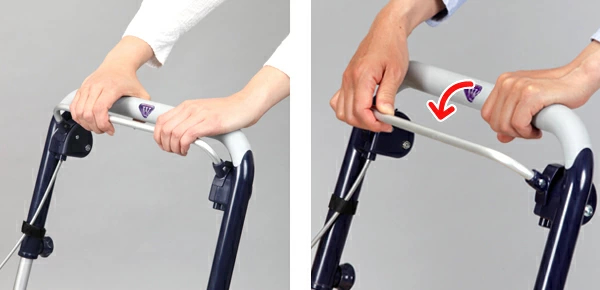 手元のレバーを握ればブレーキが掛るため、坂道の歩行も安心です。また、前に押し下げれば停車ストッパーになります。