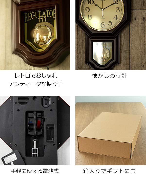 大きな振り子やチャイムのレトロ音など、ノスタルジーな雰囲気が魅力的な時計です。アンティーク風のデザインで、お部屋に懐かしさと上品さをプラスしてくれます。