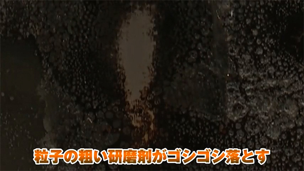 粒子の粗い研磨材がコゲをゴシゴシ落とす