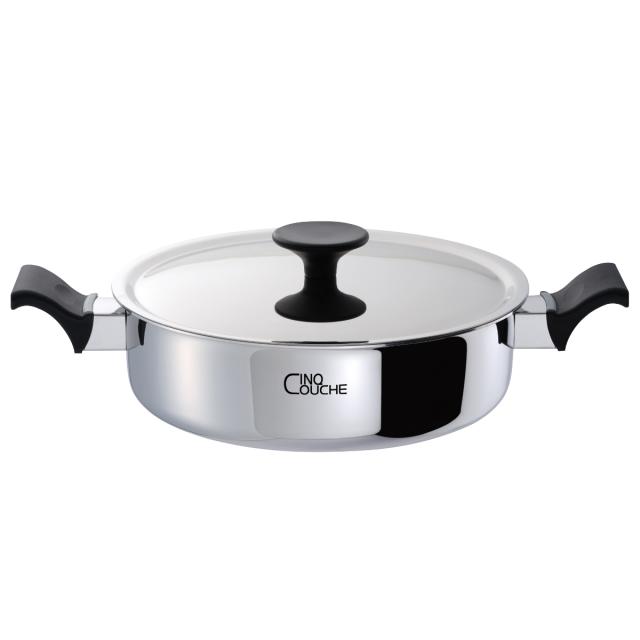 国内の自社工場で造られた全面5層構造材を使用したサンク・クーシュシリーズのキャセロールです。熱伝導性に優れ、強度を高めたアルミニウム3層を、保温性に優れたステンレスで挟み込みました。
