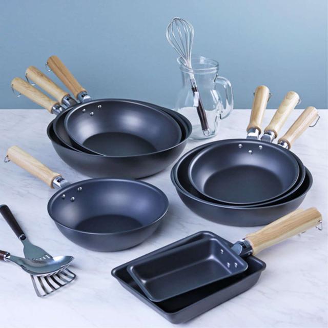 高級感のある鉄匠の鉄フライパンは、20cm〜30cmまでの豊富なサイズ展開に加えて深型タイプもあるので、用途に合わせてお選びいただけます。お弁当作りや普段使い、作り置き用など同シリーズで揃えることで毎日の料理がより快適になります。