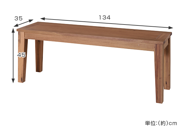 アカシアの木材を使用しシンプルに仕上げられた幅134cmの2〜3人用ベンチです。アカシアのもつ濃淡のある色合いや木材の温もりをお楽しみいただけます。またオイル仕上げであるため、「木」そのものの質感やさわり心地を感じられます。