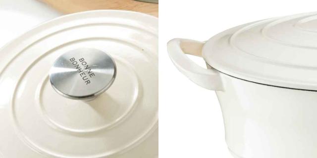 重い蓋が素材から出る水気を逃さないため、少量の水分で素材本来の深い味わいを引き出します。蓋は丈夫でつかみやすいステンレス製のつまみになっています。ボン・ボネールのロゴが入っていてとてもお洒落です。