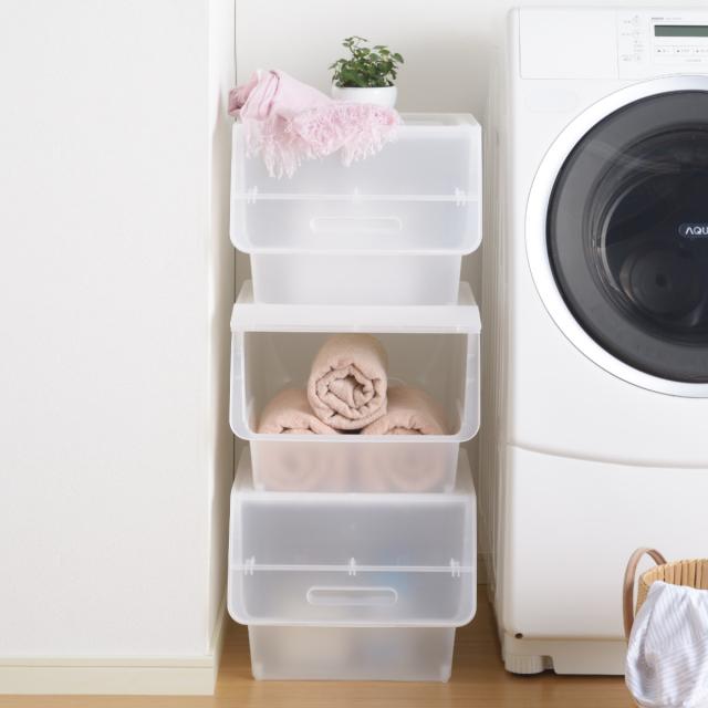 フタ付き衣装ケースなどの収納ケースは、積み重ねて使うと下段から物を取り出すのが一苦労です。「froq -フロップ-」なら前開きフタなので、積み重ねて使っても下段から簡単に物を出し入れすることできます。